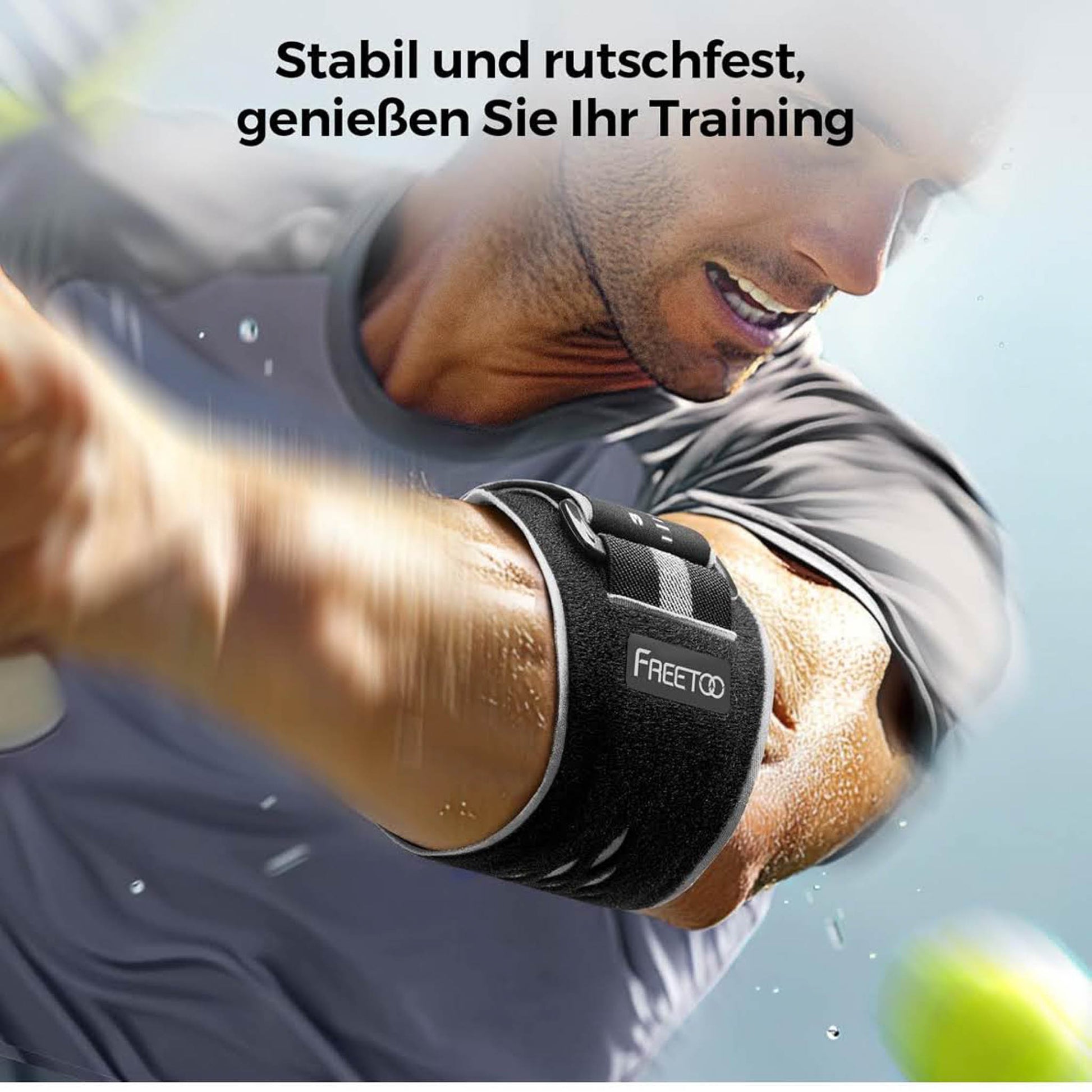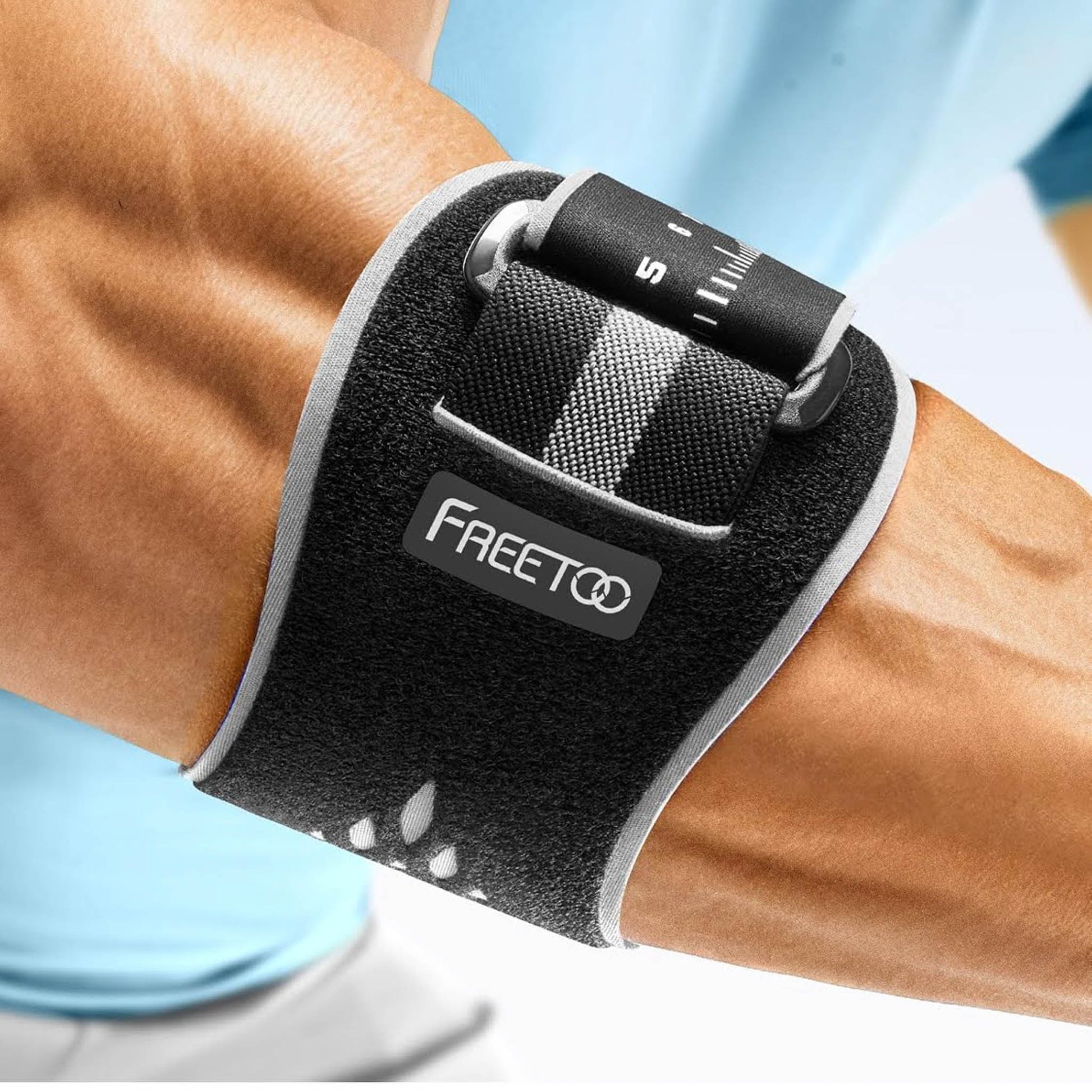 FREETOO Ellenbogenbandage, Tennisarm, für Herren/Damen, ideal bei Epicondylitis, Schwarz/Grau, optimal für Kraftsport.