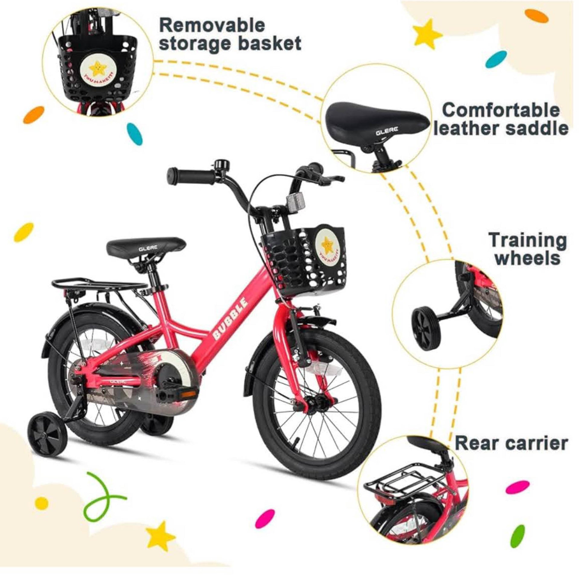 Glerc Bubble 12 Zoll Kinderfahrrad, für 1-4 Jahre, mit Korb, Stabilisatoren, Gepäckträger, rosa.