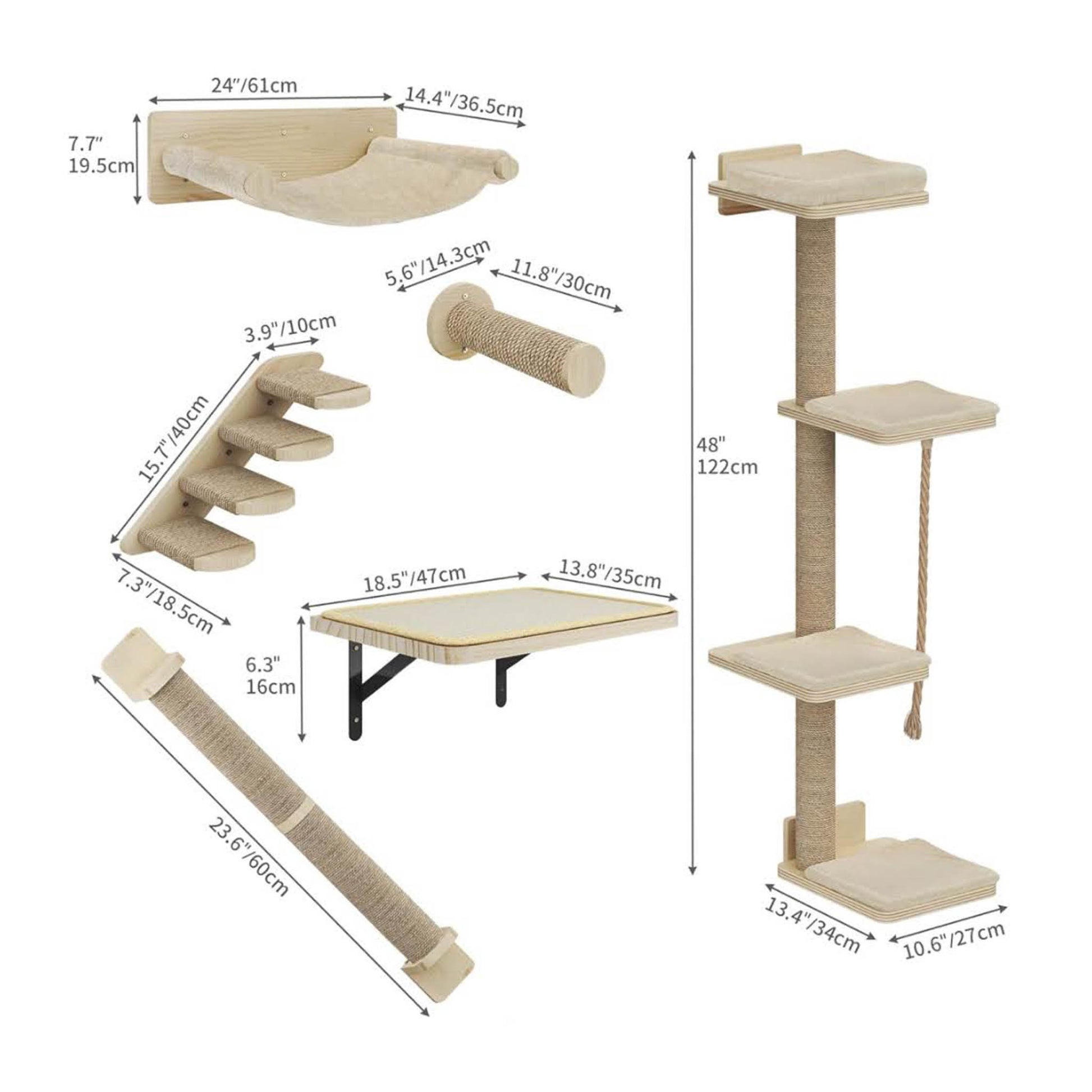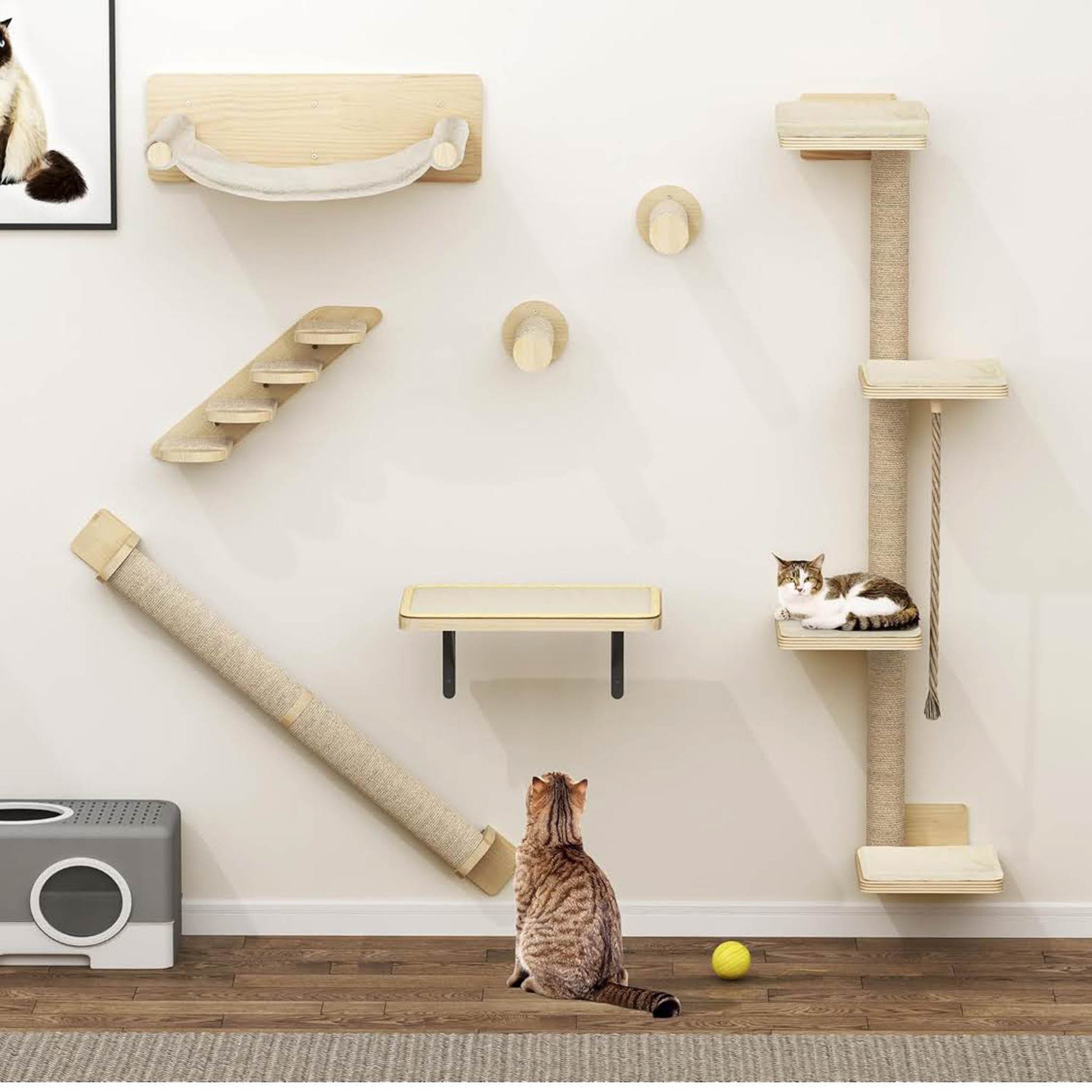 YITAHOME Katzen-Wandmöbel, 7 Teile, Holz, Kletterbaum mit 3 Kratzbäumen, 4 Stufen, Hängematte, Katzentreppe, Wandmontage.